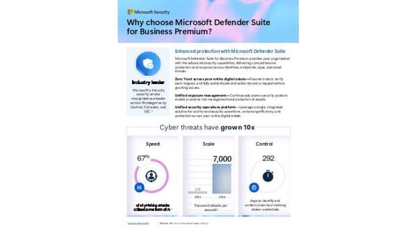 Security complexity can increase risk and slow response times. The solution brief shows how Microsoft Defender Suite for Business Premium delivers unified protection across identities, devices, apps, and collaboration. Download the solution brief to see how you can strengthen security while improving efficiency.