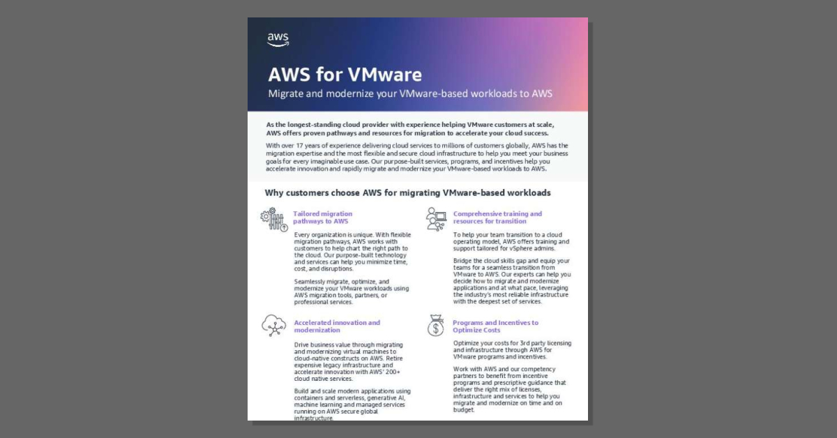 Why should you choose AWS for migrating VMware-based workloads? Tailored migration pathways, faster modernization, and comprehensive transition training are a few. Download this solution brief for more:👇 @amazon-web-services